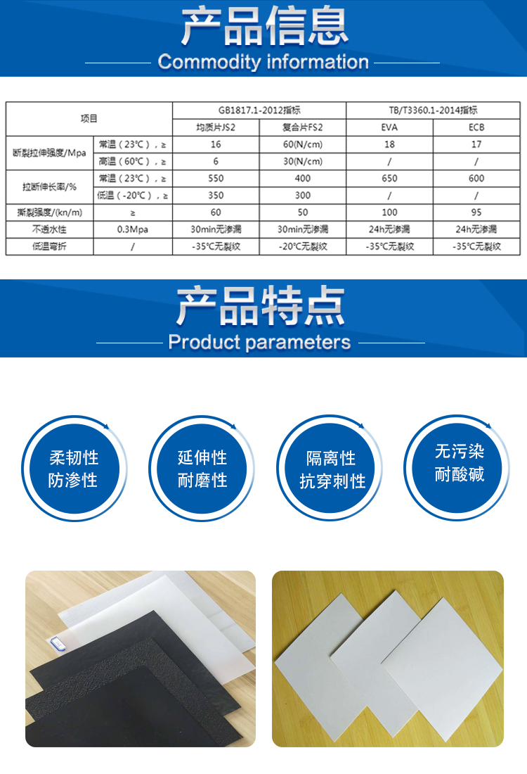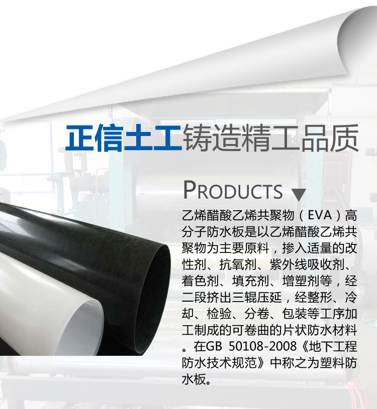 乙烯醋酸乙烯共聚物(EVA)高分子防水板是以乙烯醋酸乙烯共聚物為主要原料,摻入適量的改性劑、抗氧劑、紫外線吸收劑、著色劑、填充劑、增塑劑等,經二段擠出三輥壓延,經整形、冷卻、檢驗、分卷、包裝等工序加工制成的可卷曲的片狀防水材料。在GB 50108-2008《地下工程防水技術規范》中稱之為塑料防水板。與PE相比,EVA由于分子鏈上引入醋酸乙烯(VA)單體,從而降低了結晶度,提高了柔韌性、耐沖擊性、與填料相容性和熱密封性,并具有較好的耐環境應力開裂性,良好的光學性能、抗化學腐蝕等優點,且無毒、不吸水。施工工藝簡單,可操作性好,可修補性強。對施工環境要求低,特別適用于隧道、管道等狹小空間及通風條件差和有滲透水的環境施工。