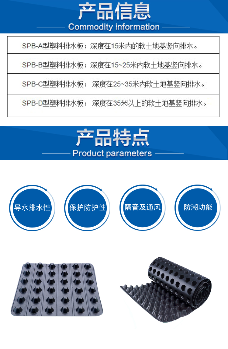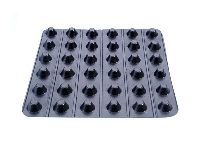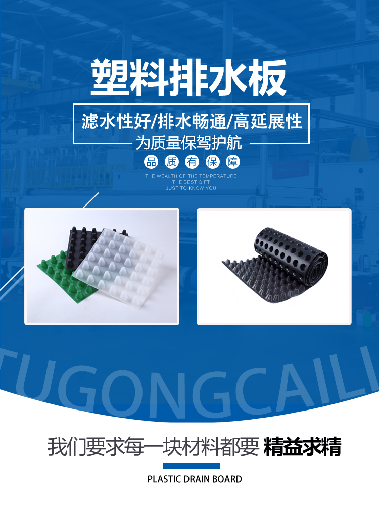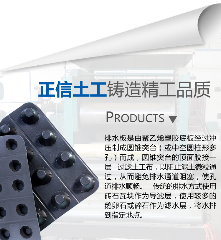 排水板是由聚乙烯塑膠底板經過沖壓制成圓錐突臺(或中空圓柱形多孔)而成,圓錐突臺的頂面膠接一層 過濾土工布,以阻止泥土微粒通過,從而避免排水通道阻塞,使孔道排水順暢。 傳統的排水方式使用磚石瓦塊作為導濾層,使用較多的鵝卵石或碎石作為濾水層,將水排到指定地點。而現在用排水板取代鵝卵石濾水層來排水則省時、省力又節能、節省投資、還能降低建筑物的荷載。