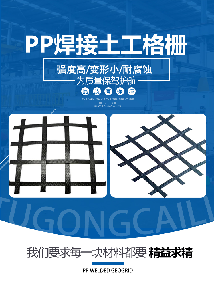 PP焊接土工格柵的肋帶系高分子塑料經擠出拉伸成型 , 具有很高的抗拉強度 . 其縱橫向肋帶的交接點以高頻超聲波焊接 , 確保了產品質量的穩定 , 保證了格柵網格對土體的有效嵌鎖。同時格柵的強度可變更肋帶的拉力,調整肋帶的多少而設計成不同的型號規格。以滿足不同工程,各種技術指標的需要。