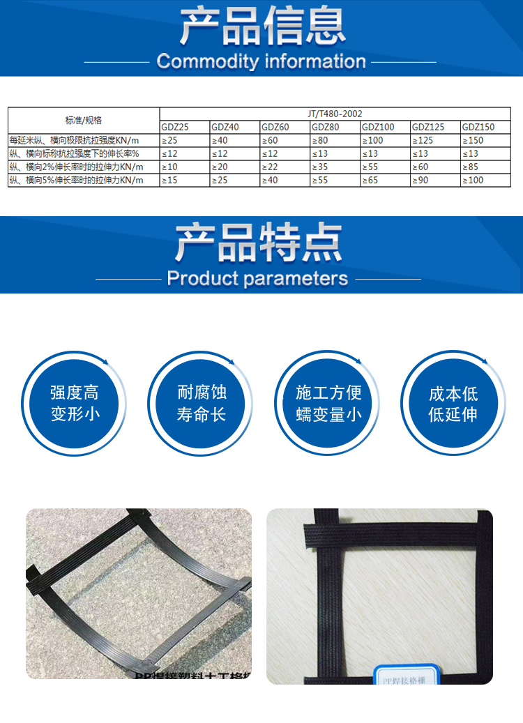 摩擦系數:產品表面經過處理,壓有粗糙的花紋,以增強其粗糙度,同時縱橫肋條形成 的網孔對土體進行嵌鎖,達到對土體最優的被動阻抗力。 PP焊接土工格柵幅寬可達 2-6.5 米等卷長可達 50 米(也可按用戶需求生產)。