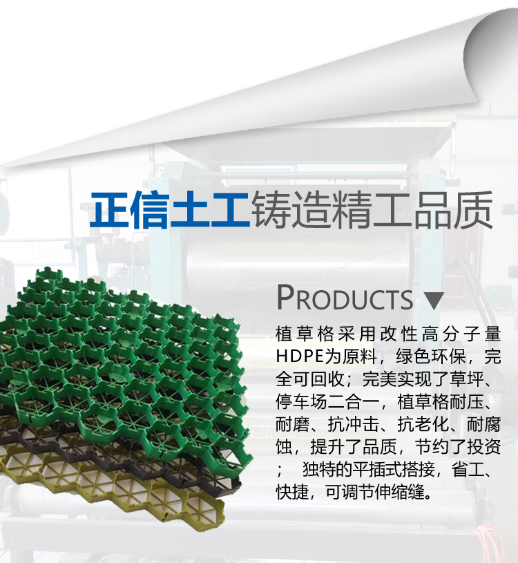 植草格采用改性高分子量HDPE為原料,綠色環保,可回收;實現了草坪、停車場二合一,植草格耐壓、耐磨、抗沖擊、抗老化、耐腐蝕,提升了品質,節約了投資; 獨特的平插式搭接,省工、快捷,可調節伸縮縫。