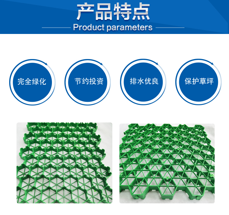 停車場用植草格完美實現草坪、停車場二合一,提升品質,節約投資。 獨特的平插式搭接,省工、快捷,可調節伸縮縫。 采用改性 高分子量HDPE為原料,綠色環保,完全可回收。