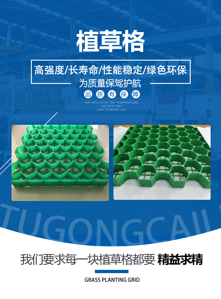 其次可以利于植草的成長;植草格的透水性、透氣性等長處,十分利于雨水的下滲,能夠推進花卉、草皮根系以及葉花果莖的發育成長,不致于斷根而影響成長,友好的避免了人行踐踏。